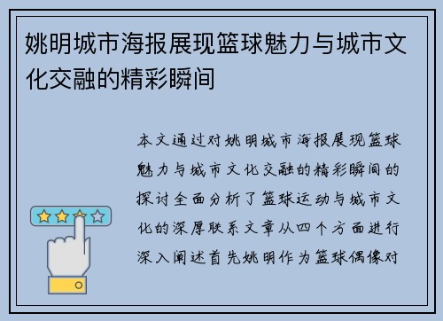 姚明,这位中国篮球的传奇巨星,不仅在体育领域取得了卓越成就,更在社会责任和公益事业中展现了无可比拟的影响力。本文将围绕“姚明蓝丝带”的背后故事与他的公益之路展开,探讨他如何利用自己的知名度和资源来推动社会公益、关注儿童健康以及促进体育文化的发展。首先,文章将介绍姚明的个人背景及其对蓝丝带运动的参与;接着,分析蓝丝带所代表的意义以及其对公众意识的提升作用;随后,将讨论姚明在推动社会责任方面所做出的努...